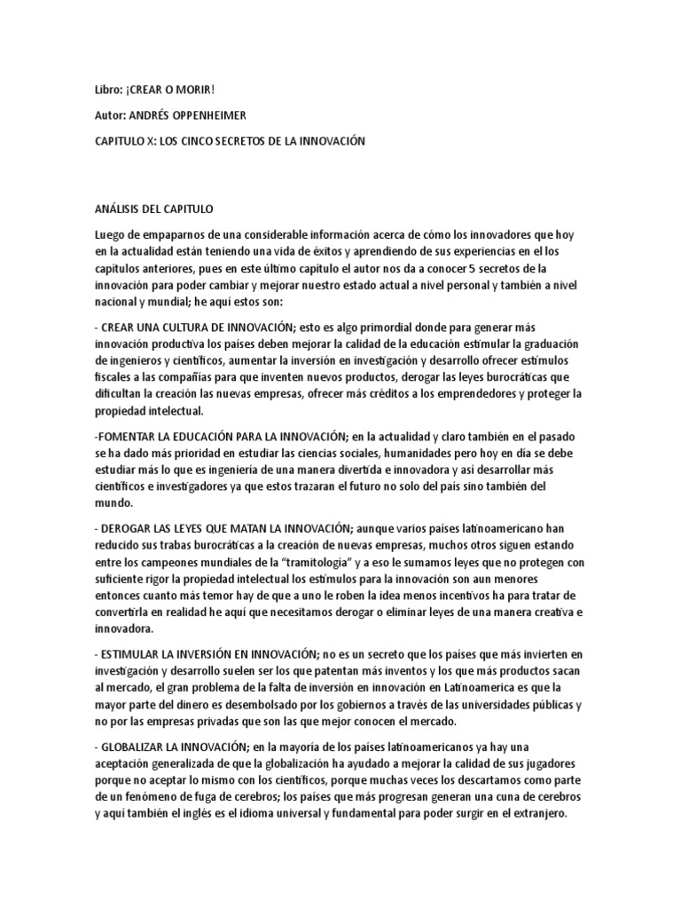 Crear o morir resumen capitulo por capitulo. Crear o Morir Por. Andrés Oppenheimer Capitulo 2. Resumen del libro de Andrés Oppenheimer que describe el éxito de personas que se arriesgaron a ser empresarios a partir de una necesidad o.
