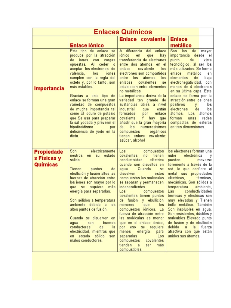 Elabora Un Cuadro Comparativo De Los Enlaces Ionico Covalente Y Metalico Considerando Elementos Que Forman El Enlace Caracteristicas