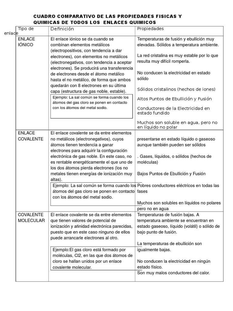 Tipos De Enlaces Quimicos Cuadro Comparativo