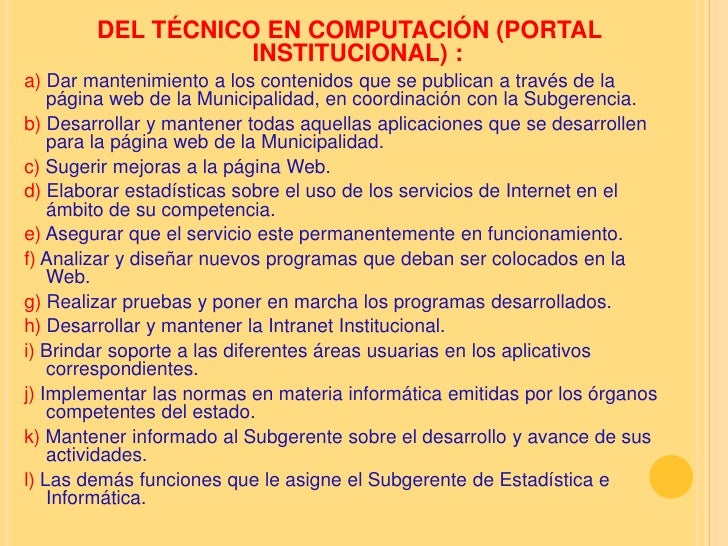 Administrar la página Web de la Institución. Funciones generales que realiza un departamenento de Soporte Técnico dentro de una organización.