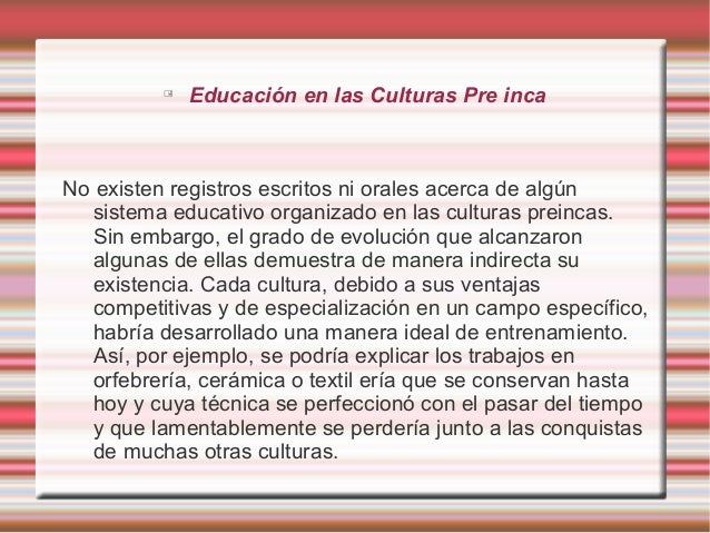 No existen registros escritos ni orales acerca de algún sistema educativo organizado en las culturas pre incas sin embargo el.