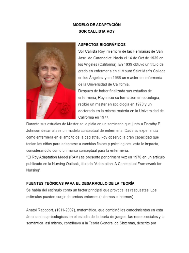 Metaparadigmas de callista roy. Sor Callista Roy miembro de las Hermanas de San Jose de Carondelet Nacio el 14 de Oct de 1939 en los Angeles California. En 1939 obtuvo un titulo de grado en enfermeria en el Mount Saint Mars College en los Ángeles y en 1966 un master en enfermeria de la Universidad de.