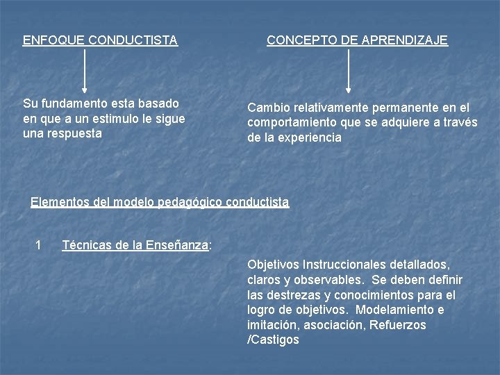 Su fundamento teórico está basado en que a un estimulo le sigue una respuesta siendo ésta el resultado de la interacción entre el organismo que recibe el. Enfoque conductista en el aprendizaje Ver.