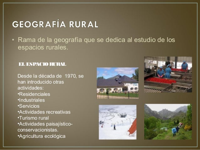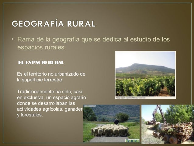 Esta rama de la geografía se encarga de analizar la conformación del espacio a partir de los usos agrícolas ganaderos y comerciales. Estudia las transformaciones del estudio rural de acuerdo a la economía de un país la distribución de la propiedad las migraciones y desplazamientos de población los problemas técnicos de producción la problemática ambiental y la.