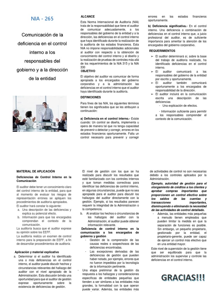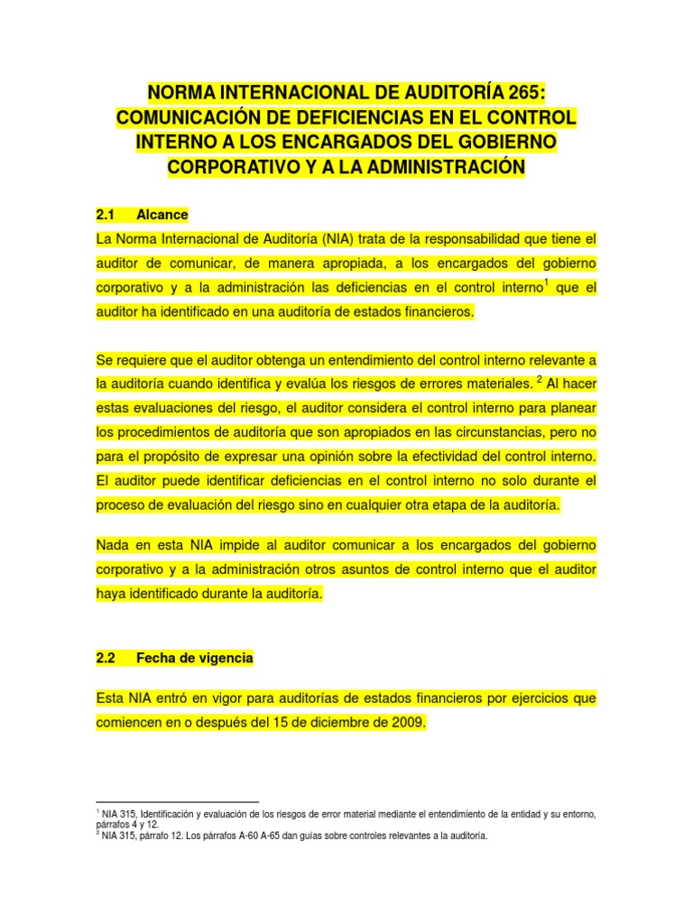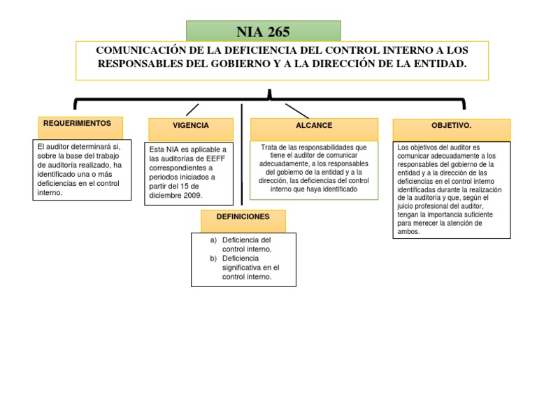 COMUNICACIN DE DEFICIENCIAS EN EL CONTROL INTERNO El alcance de esta NIA se basa en la responsabilidad y la manera mas adecuada en la que el auditor comunica a la administracin y al gobierno. NIA 265 Informe de control interno Alcance Esta Norma Internacional de Auditoría NIA trata de la responsabilidad que tiene el auditor de comunicar adecuadamente a los responsables del gobierno de.