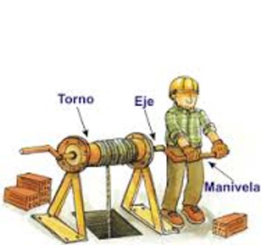 Al aplicar una fuerza sobre la manivela de la rueda para hacerla girar el eje que es más delgado gira con mayor fuerza lo cual hace que se pueda mover una carga pesada con un pequeño mecanismo o máquina es el torno.