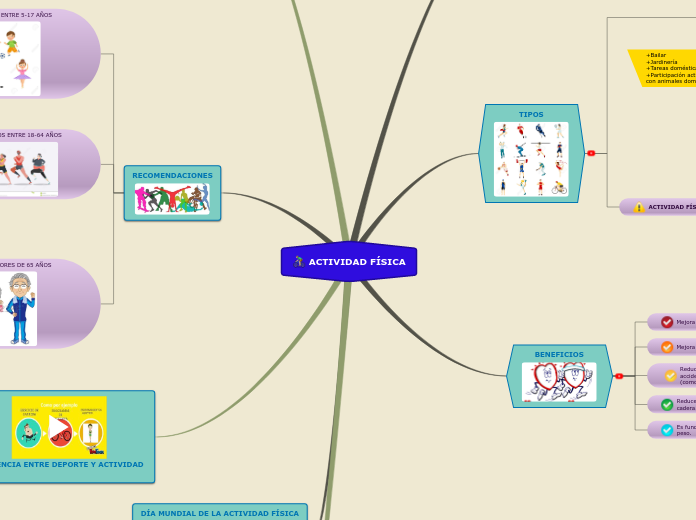 Mapa mental de actividad fisica. Requiere más energía que estar en reposo. Cuerpo que hace trabajar a los músculos y. Unos pocos ejemplos de actividad física.