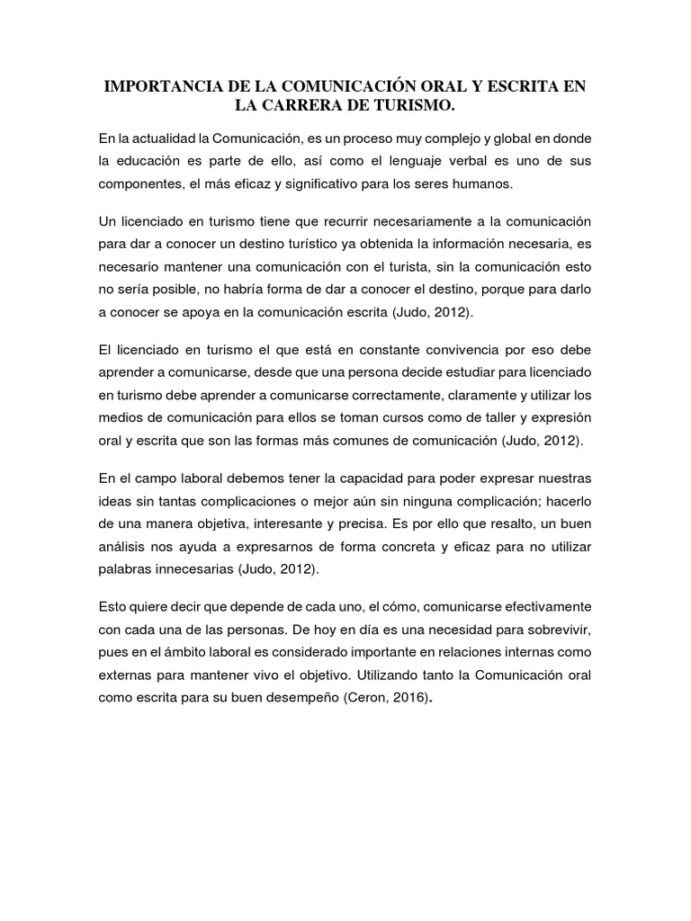Importancia De La Comunicacion Oral Y Escrita En La Carrera De Turismo Pdf Habla Turismo