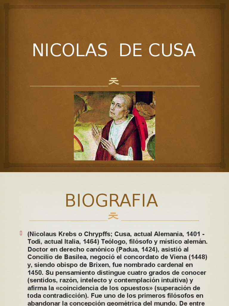 Biografia de nicolas de cusa. Nicolás de Cusa nació en 1401 en la pequeña localidad de Kues a orillas del Mosela en la diócesis de. Nicolaus von Kues o Nicolás de Cusa nombre latino del filósofo y matemático alemán Nikolaus Krebs nació en el año 1401 en Cues cerca de TreviriFué el.