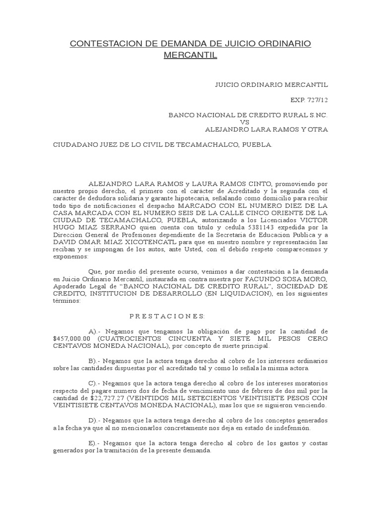 Contestacion De Demanda De Juicio Ordinario Mercanti1 Pdf Credito Finanzas Bancos