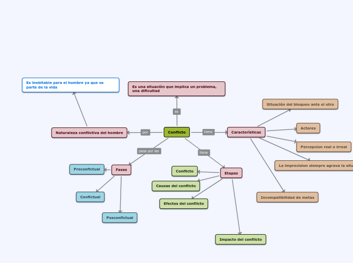 Mapa mental que vincula las caracteristicas del conflicto y los pasos a seguir para poder solucionarlo. El conflicto como proceso se puede dividir en.