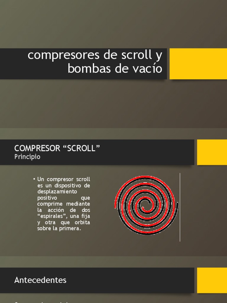 Refrigeracion Rino C A Compresores De Espirales Concentricos Scroll Consisten En Dos Espirales Metalicos Montados De Tal Manera Que Uno Orbita Excentricamente Manteniendo Permanentemente Una Linea De