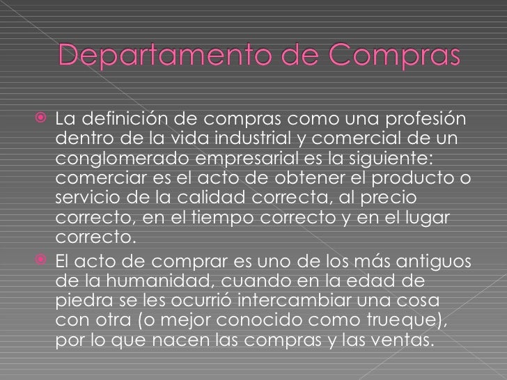 El departamento de compras es el área de la empresa y todos los profesionales que la forman que tiene por objetivo resolver las necesidades de abastecimiento. Hacer que el proveedor invierta en una relación a largo plazo. Tiene que trabajar con las partes interesadas internas como mercadeo finanzas logística y distribución para garantizar que.